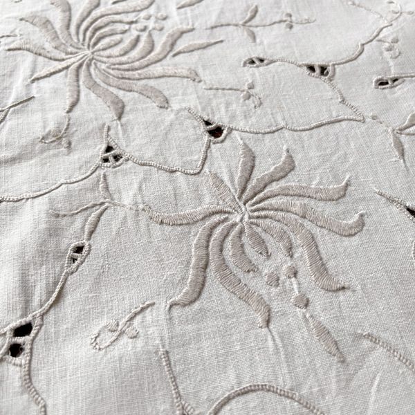 アイレットのディテールもチャーミングな要素の一つです。細かな穴が空いたアイレットのデザインが、プレースマットにエレガントな風合いをもたらします。