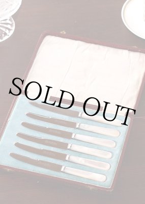 〈イギリス〉シェフィールド製造 マザーオブパール(白蝶貝ハンドル) アンティークシルバープレート バターナイフ 箱入り6本セット [CO1762]