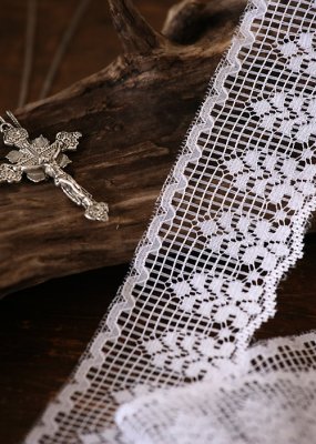 少し太めの糸で、ハンドメイドで丁寧に編まれた、やさしいクリーム色のレースになります。